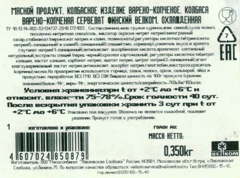 Колбаса Велком сервелат Финский варено-копченый, 350г