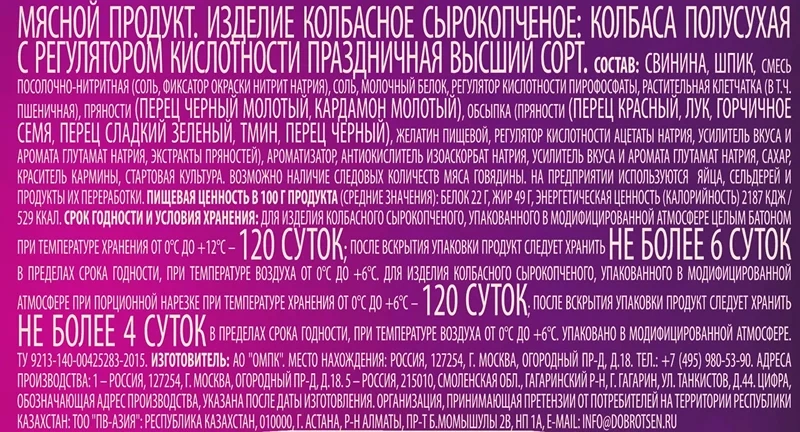 Колбаса Останкино Праздничная в специях сырокопченая, ~500г