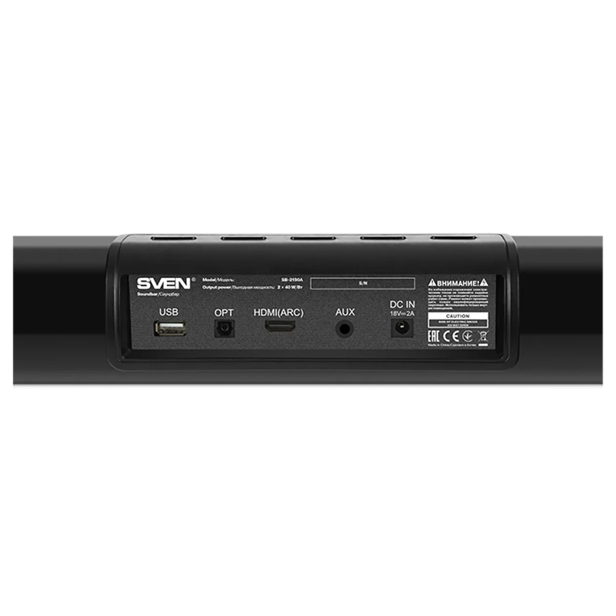 SVEN SB-2150A может работать как с телевизором, так и с другими устройствами благодаря поддержке Bluetooth 5.0, HDMI ARC, оптического цифрового входа и аналогового AUX. И даже это еще не все: также устройство оборудовано плеером для аудиофайлов, работающим с USB-накопителями и TF-картами.