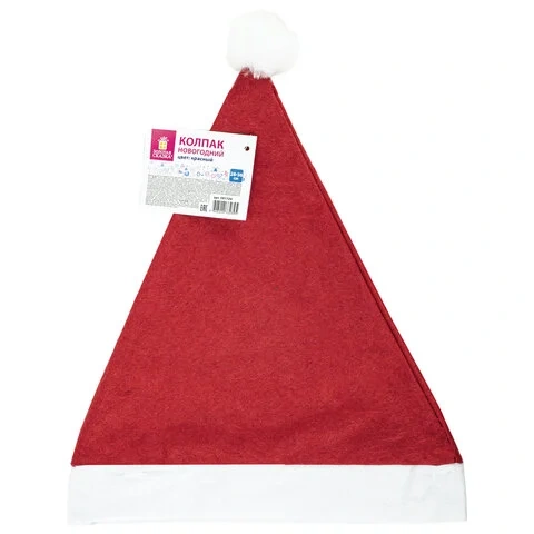 Колпак новогодний размером 30х38 см выполнен в форме треугольника из нетканого полипропилена красного и белого цветов. Сверху колпака имеется помпон белого цвета из полипропилена. Товар c навесной этикеткой.