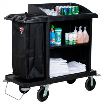 Гостиничная тележка большой вместительности, разработана для больших отелей. Одной полной загрузки достаточно для уборки 16 номеров. Сочетает легкость и универсальность с исключительной маневренностью, что помогает горничным работать более продуктивно, а также снижает количество нагрузок и травм. Оборудованна бесшумными не оставляющими следов колесами. Верхняя и нижняя часть выполнены из единой литой конструкции, что делает тележку невероятно долговечной.