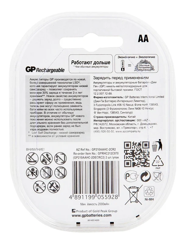 Никель-металлогидридные аккумуляторы GP типоразмера АА подходят для широкого спектра устройств. Особенно хорошо они справляются в компьютерных мышках и клавиатурах, о чем свидетельствует рисунок на упаковке. GP 210AAHC-2DECRC2 – аккумуляторы нового поколения, созданные по технологии LSD (Low Self Discharge), то есть с низким саморазрядом в процессе хранения. Так, за 2 года в режиме ожидания они сохранят минимум 50% изначального заряда. Это удобно, если вы установили аккумуляторы, например, в фотоаппарат, которым пользуетесь только время от времени. Или они работают в осветительных приборах на даче, включаемых по выходным дням. Аккумуляторы GP рассчитаны на 500 циклов зарядки-разрядки. То есть, приобретая упаковку из 2 элементов, вы экономите на покупке до 1000 одноразовых батареек.