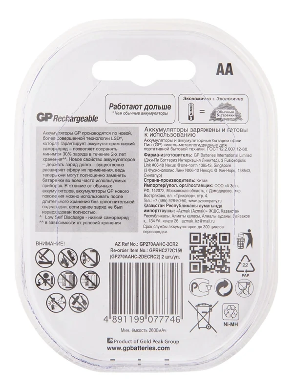 Никель-металлогидридные аккумуляторы емкостью – 2600 мАч. Во время зарядки они запасают большое количество энергии, а работая в устройствах, тратят ее крайне экономично. Поэтому аккумуляторы GP – это лучший выбор для энергоемких, часто используемых девайсов: фонариков, часов, игровых мини-приставок, будильников, плееров, компьютерных мышек и клавиатур, детских игрушек, медицинских приборов и т. д. Аккумуляторы выдерживают до 500 циклов перезарядки. Также никель-металлогидридные аккумуляторы выгодно отличаются отсутствием эффекта памяти: их не нужно полностью разряжать, чтобы они соответствовали своей номинальной емкости.