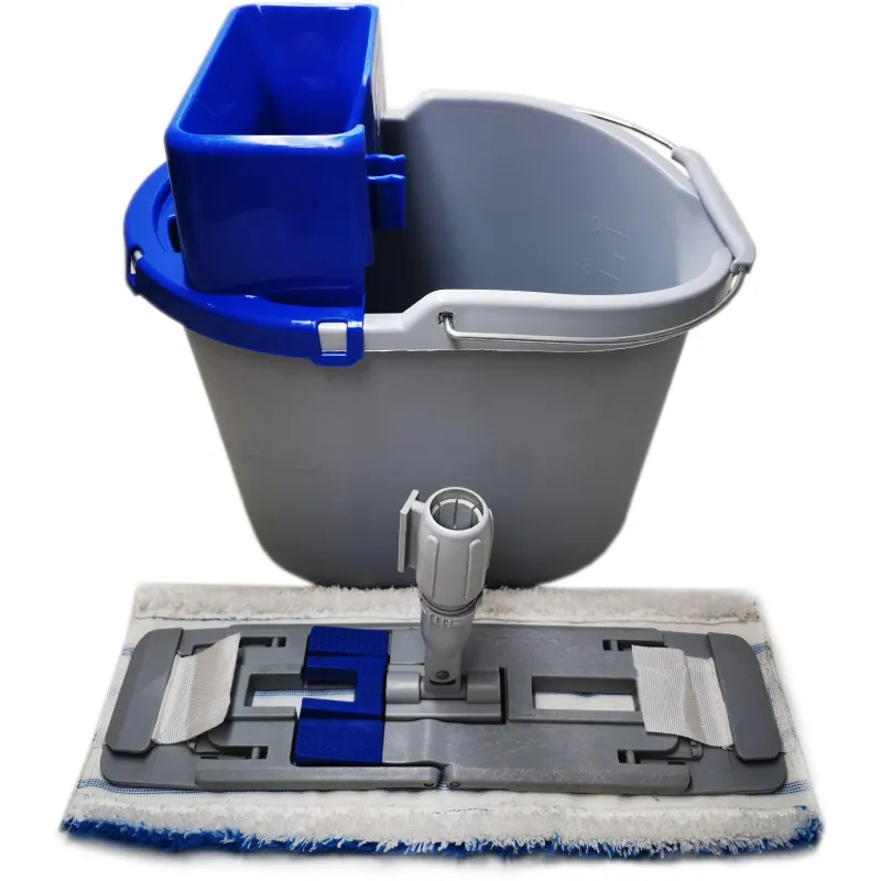 Ведро: Ведро 10л. — полипропилен, Ручка ведра — нержавеющая сталь, Отжим синего цвета — полипропилен, Держатель насадки 40×10 см, полипропилен, Моющая насадка с креплением карман язык (40×10 см): моющая часть — микрофибра, крепление полиэстер.