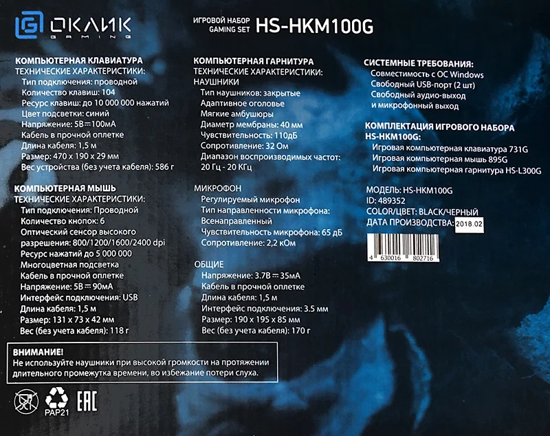 Комплект Оклик HS-HKM100G IMPERIAL (клавиатура, мышь, гарнитура) черный (489352)
