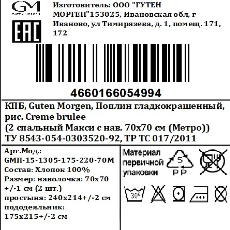 | Комплектация | наволочка - 2 шт. 70х70см; пододеяльник - 1 шт. 175х215см; простыня - 1 шт. 214х240см |
