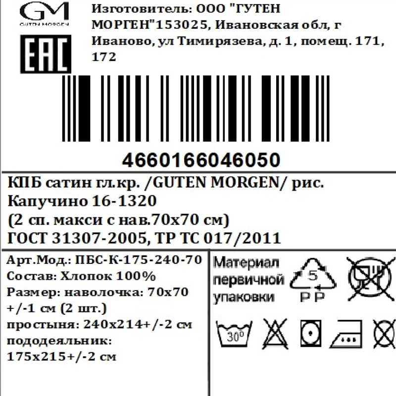 | Комплектация | наволочка - 2 шт. 70х70см; пододеяльник - 1 шт. 175х215см; простыня - 1 шт. 214х240см |