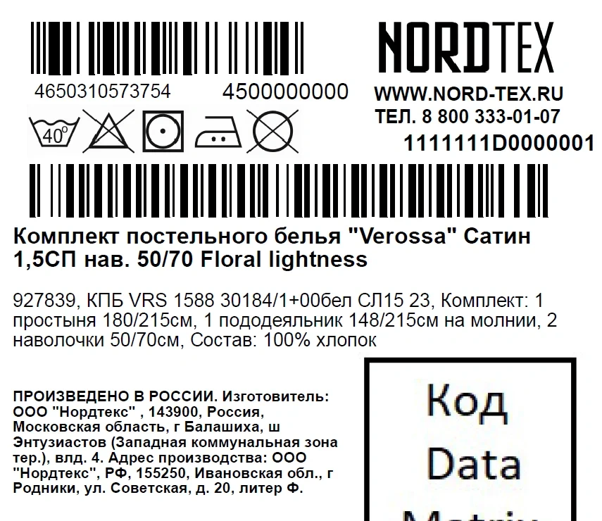 | Комплектация | наволочка - 2 шт. 50х70см; пододеяльник - 1 шт. 148х215см; простыня - 1 шт. 180х215см |