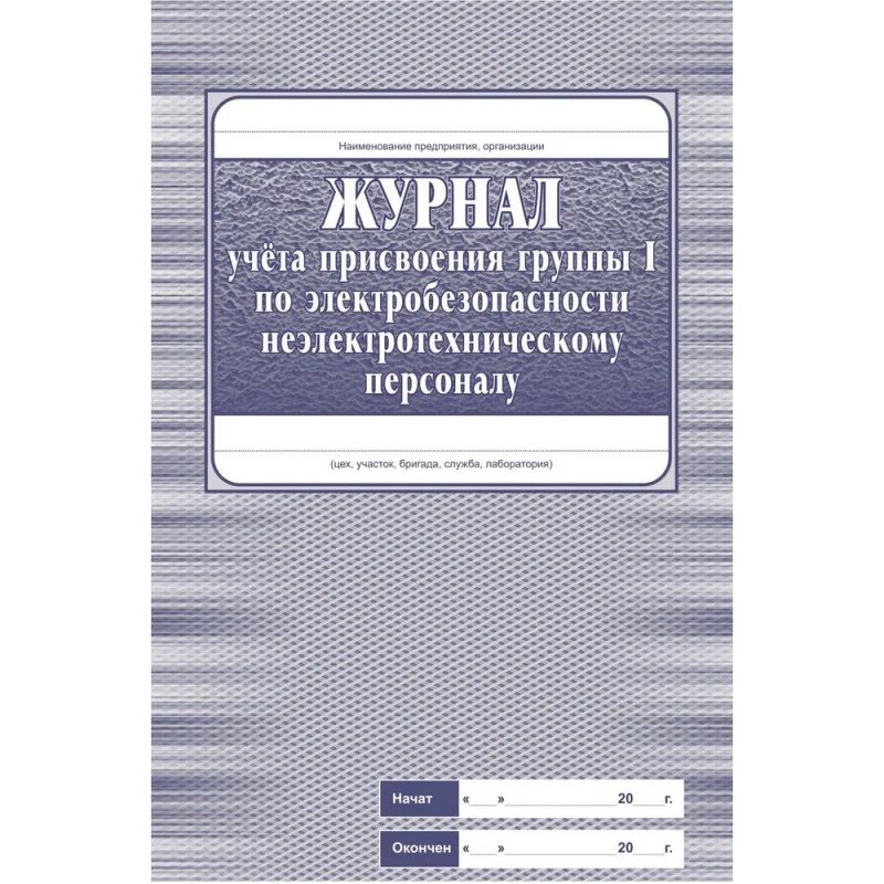 — журнал учета присвоения группы 1 по электробезопасности неэлектротехническому персоналу. Формат А4. Обложка выполнена из офсета плотностью 120 г/кв.м. Блок состоит из писчей бумаги плотностью 60 г/кв.м. Содержит 16 листов;