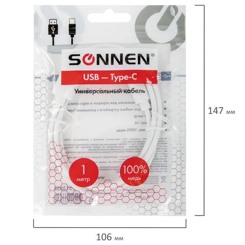 Кабель белый USB 2.0-Type-C, 1 м, SONNEN, медь, для передачи данных и зарядки, 513558