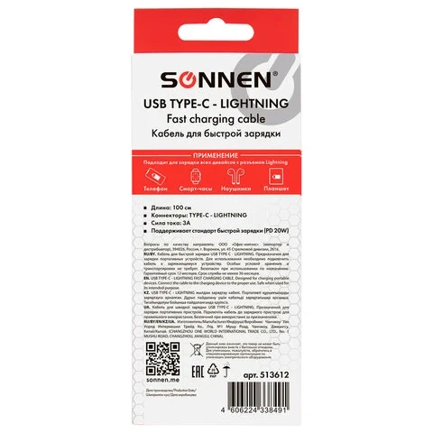Кабель USB Type-C-Lightning с поддержкой быстрой зарядки для iPhone, белый, 1 м, SONNEN, медный, 513