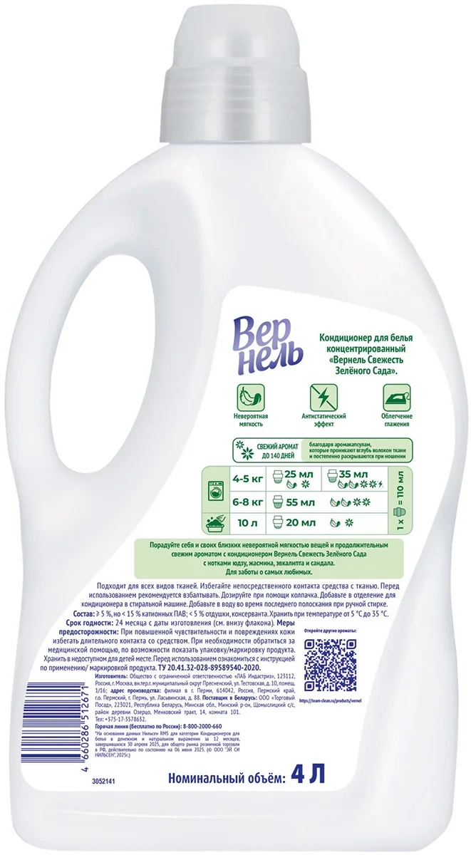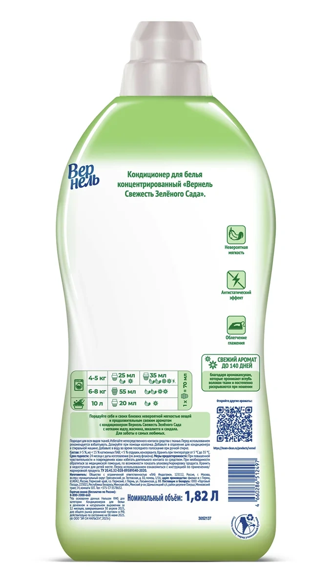 Кондиционер придает белью антистатические свойства, приятный запах и способствует сохранению яркости цвета.