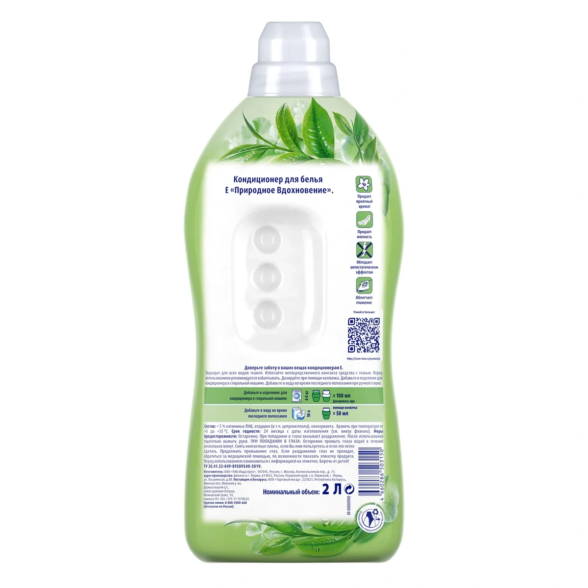 Кондиционер для белья E Природное вдохновение, 2л бережно и деликатно ухаживает за любой одеждой. Благодаря современной формуле из катионных ПАВ и глицерина кондиционер Фреш обладает эффективными преимуществами.- Благодаря кондиционеру белье будет мягким и приятным на ощупь.- Средство E Природное Вдохновение дарит белью свежесть и приятный аромат, который сохраняется длительное время.- Кондиционер E Природное Вдохновение облегчает глажку и обладает антистатическим эффектом.