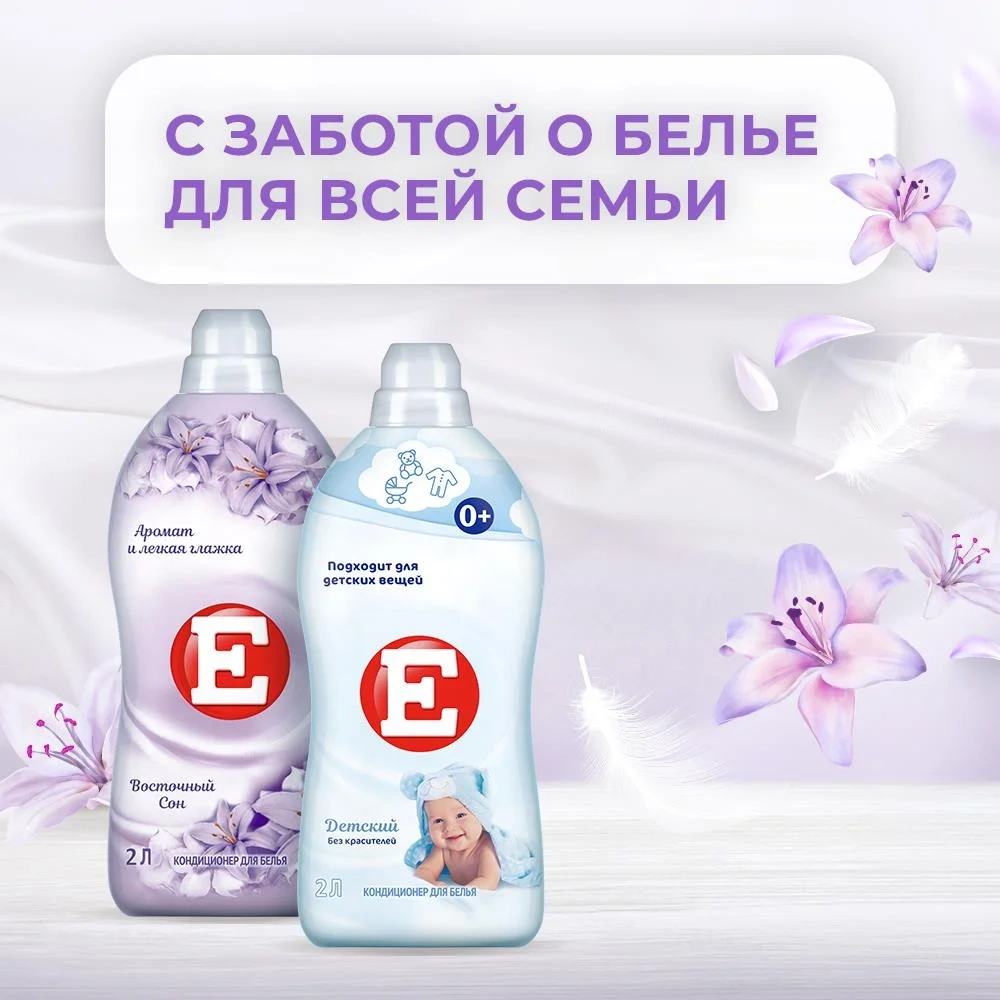 Кондиционер для белья E 'Восточный сон' ухаживает за любой одеждой благодаря современной формуле из ПАВ и глицерина. Благодаря кондиционеру белье будет мягким и приятным на ощупь.