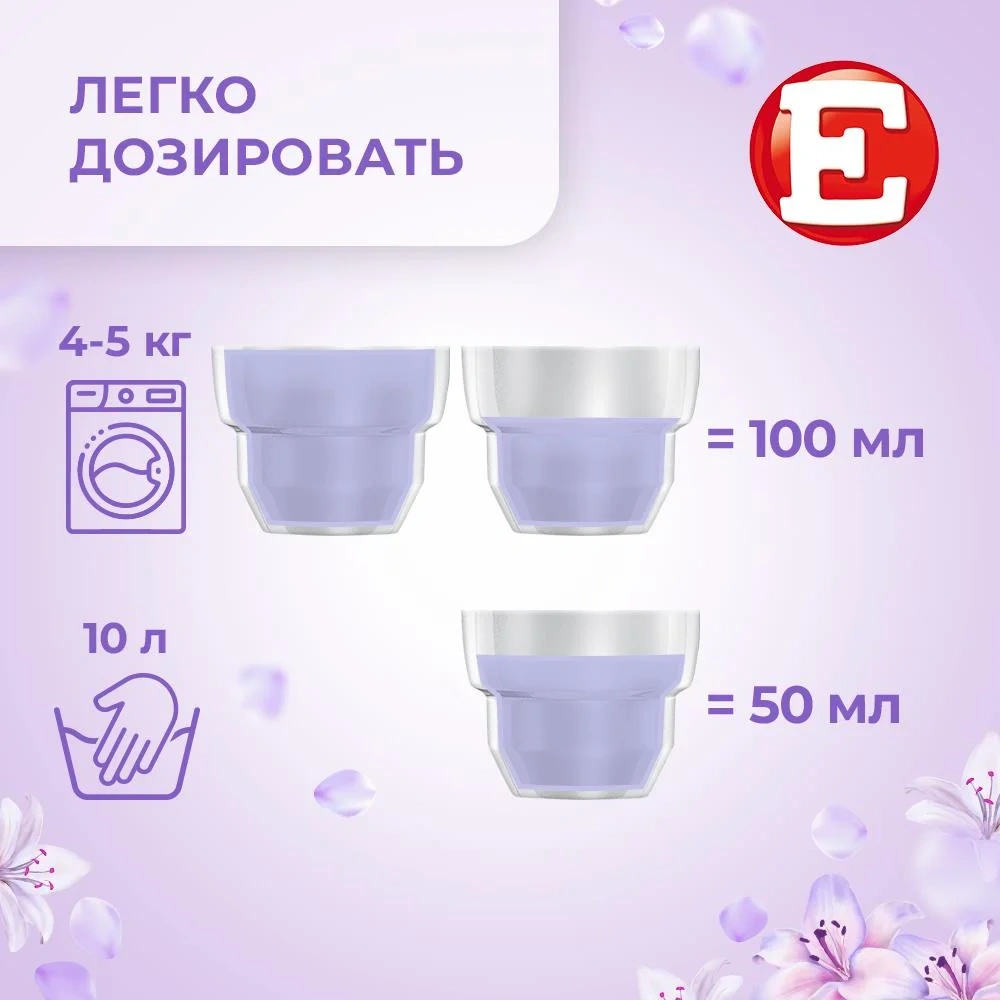 Применение: ополаскиватель для белья Е прост в использовании. Благодаря удобной крышке-дозатору вы всегда будете знать, сколько ополаскивателя для белья необходимо добавить в отделение для кондиционера в стиральной машине или при ручной стирке. Его не нужно разбавлять водой. Перед использованием рекомендуется взбалтывать. Информация по дозировке указана на обратной стороне упаковки.
