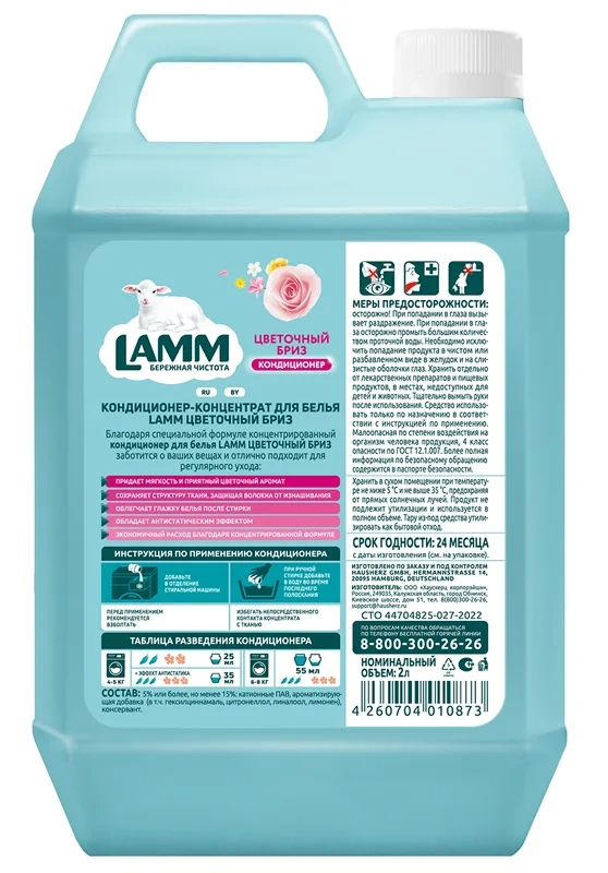 Кондиционер для белья Lamm Цветочный бриз, 2л придает белью не только особую мягкость, но и изысканной цветочной аромат. Кондиционер бережно заботится о ткани, обволакивая волокна, он защищает структуру ткани, облегчает глажку и обладает антистатическим эффектом. Перед применением рекомендуется взболтать