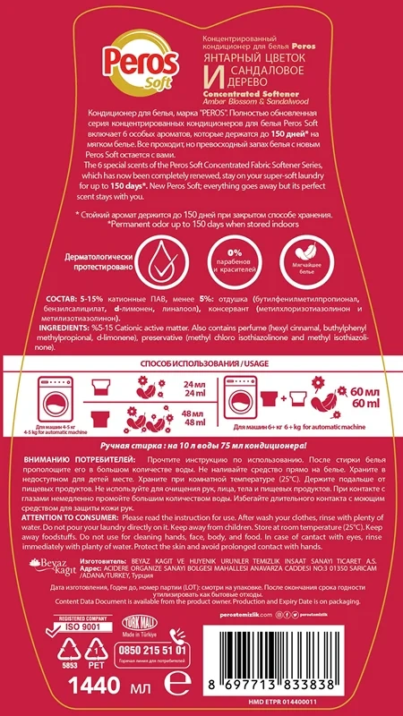 Парфюмированная, концентрированная линейка кондиционеров-ополаскивателей для стирки белья Peros - это деликатный уход для белья из всех видов тканей: хлопка, шерсти, вискозы, мембраны, шелка, тканей из синтетических волокон и т.п. Кондиционер эффективен в мягкой и в жесткой воде, можно применять для стирки белых, черных и цветных вещей. Новая формула Peros soft, которая не содержит фосфатов, агрессивных ПАВ, и хлор, подарит белью мягкость, свежесть и деликатный тонкий аромат на срок до 150 дней. Линейка кондиционеров Peros Soft не содержит аллергенов и прошла дерматологические тесты, подтвержденные экспериментами дерматологов и аллергологов, подходит для детской одежды и чувствительной кожи. Обладает антистатическим эффектом, защищающий одежду от признаков старения и выцветания, потери формы и образования катышков. При этом одежда меньше мнется, легче гладится и быстрее высыхает. При выборе продукции Peros вы забудете про другие модели кондиционеров для стирки белья. Аромат, который держится до 150 дней на мягком белье при закрытом способе хранения. Применяется для всех видов тканей. Экологически чистый и гипоаллергенный состав средства позволяет применять его для белых, цветных, черных и детских вещей, облегчает дальнейший процесс глажения, обладает антистатическим эффектом и подходит для повседневного использования.