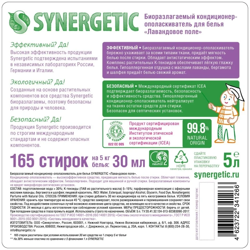 Биоразлагаемый кондиционер-ополаскиватель для белья SYNERGETIC 'Лавандовое поле' – высокоэффективное средство, бережно ухаживающее за всеми типами ткани, в том числе деликатными, и придающее особую мягкость и нежность белью после стирки. Гипоаллергенный кондиционер-ополаскиватель нейтрализует остатки средств для стирки на ткани, помогает сохранить структуру ткани, защищая волокна от изнашивания и повреждения. Средство обладает антистатическим эффектом. Комплекс растительных К-тензидов обеспечивает легкую глажку белья после стирки и высыхания. Гипоаллергенная парфюмерная композиция с эфирными маслами лаванды, бергамота и шалфея придает белью нежный и приятный аромат. Подходит для ручной и машинной стирки, полностью выполаскивается из тканей. Международный экологический сертификат ICEA подтверждает биоразлагаемость, безопасность и эффективность средства. Биоразлагаемые компоненты не вредят микрофлоре септических установок.