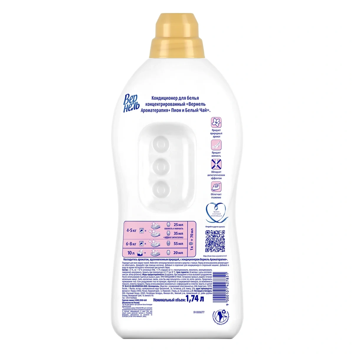 Концентрированный кондиционер для белья Вернель Ароматерапия+ Пион и Белый Чай 1740 мл (69 стирок) подарит Вашему белью нежный, расслабляющий аромат, вдохновленный самой природой. Благодаря специальным аромакапсулам кондиционер для стирки Вернель позволит наслаждаться интенсивным ароматом до 140 дней. Кондиционер для белья Вернель Ароматерапия+ отвлечет Вас от повседневных забот с ароматом пиона, белого чая и нотками кедра и мускуса.