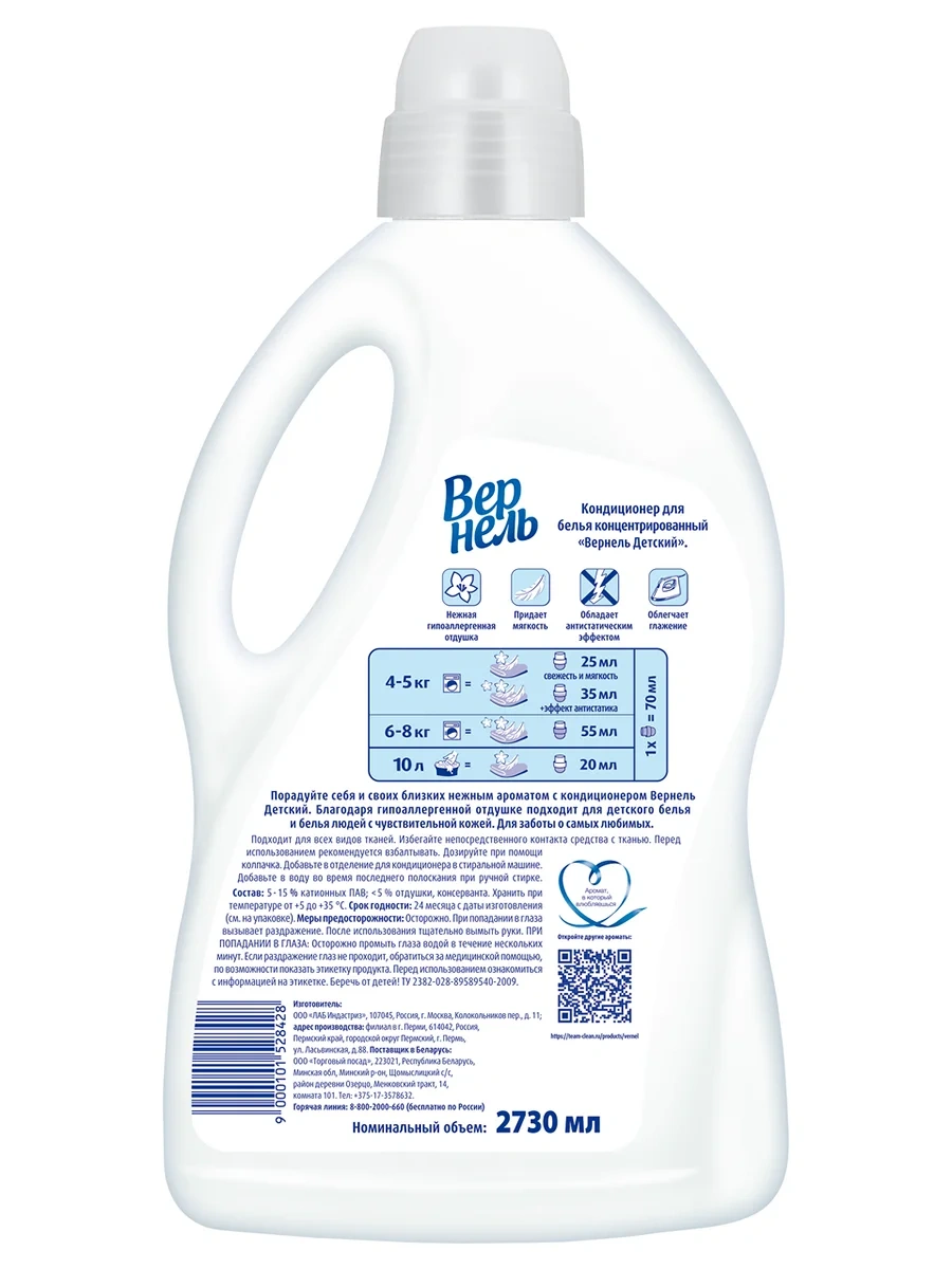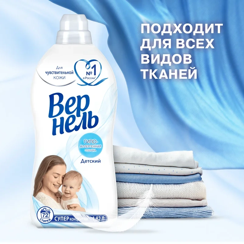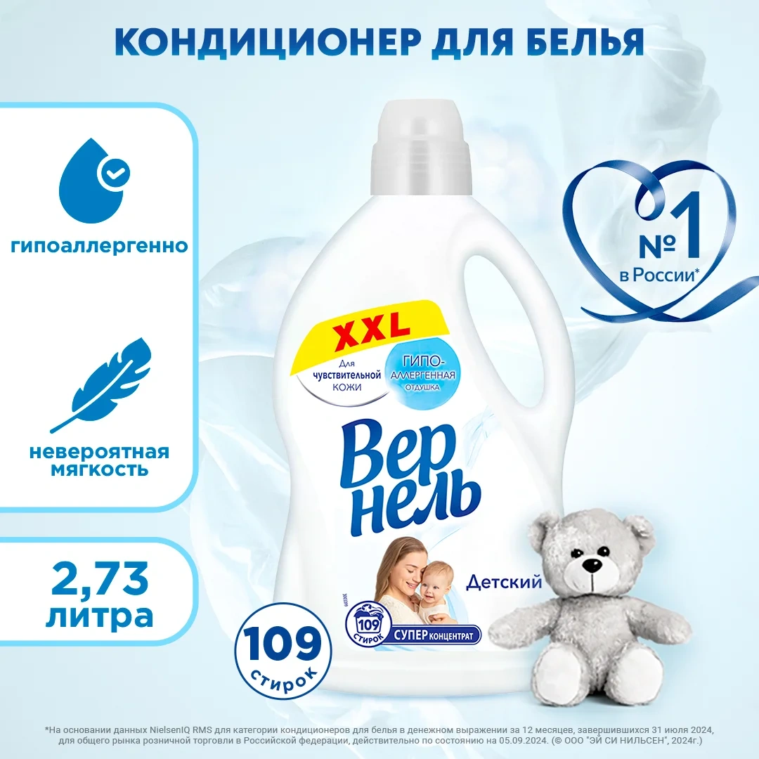 Концентрированный кондиционер для белья Вернель Детский 2730 мл, 109 стирок предназначен для стирки детского белья, а также одежды людей с чувствительной кожей и склонных к аллергии. Почему многие мамы отдают предпочтение Кондиционеру Вернель для детей? Кондиционер Вернель Детский придает белью невероятную мягкость и свежесть. Средство Вернель Детский подходит для стирки вещей для людей с чувствительной кожей и склонных к аллергии. Гипоаллергенная отдушка. Проверено ECARF. Средство Вернель Детский обладает мягким нейтральным ароматом. Кондиционер для стирки облегчает глажку, а также обладает антистатическим эффектом. Средство Вернель благодаря высокой концентрации очень экономично расходуется: на одну стирку достаточно меньше половины колпачка. Поэтому концентрированного средства для полоскания хватает на длительное время. Благодаря удобной крышке-дозатору вы всегда будете знать, сколько ополаскивателя для белья необходимо добавить.