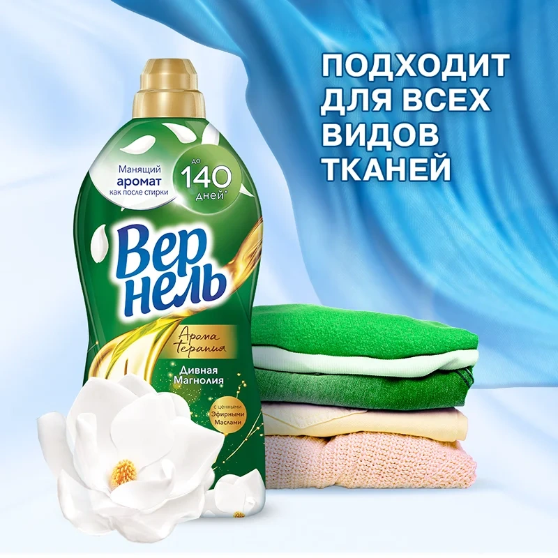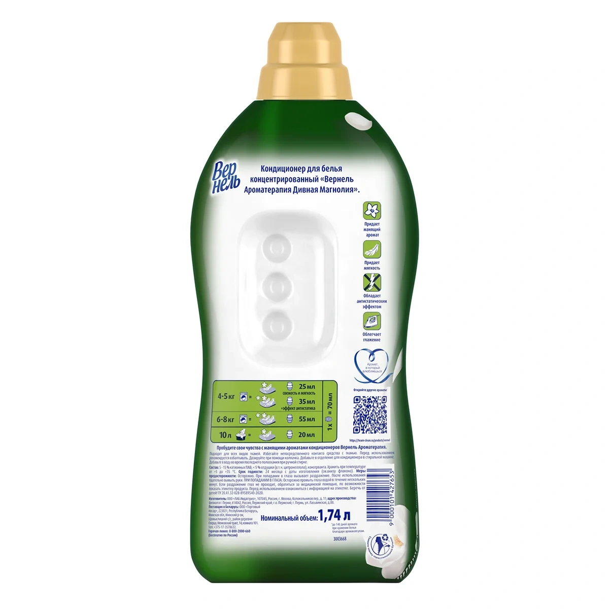 Концентрированный кондиционер для белья Вернель Ароматерапия Дивная магнолия 1,74л (69 стирок) подарит Вашему белью не только невероятную мягкость, но и магический аромат магнолии, а благодаря специальным аромакапсулам в составе кондиционер для стирки Вернель позволит наслаждаться интенсивным ароматом белья до 140 дней.