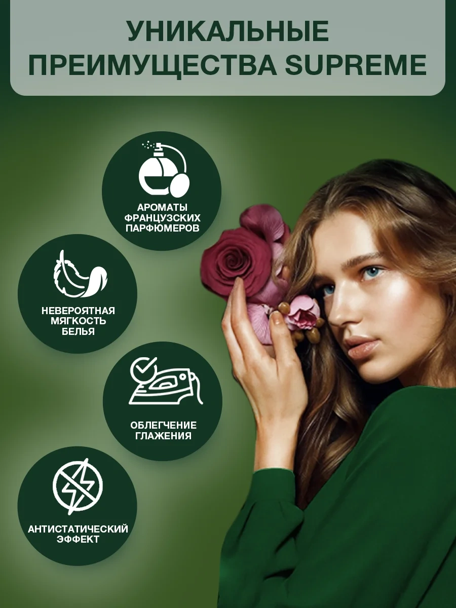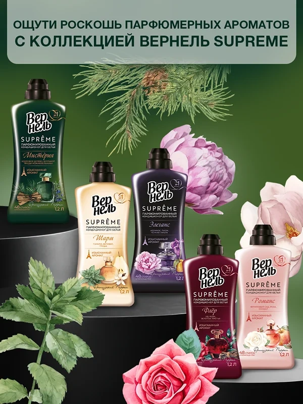 Ароматическая композиция Вернель Supreme, созданная совместно с французскими парфюмерами, подарит изысканный аромат Вашему белью. Особая формула обеспечит смягчение ткани, а также окутает продолжительным ароматом за счет постепенно раскрывающихся аромакапсул.