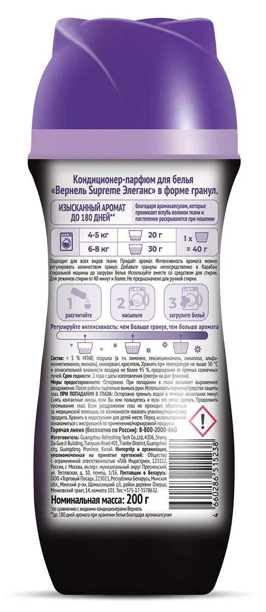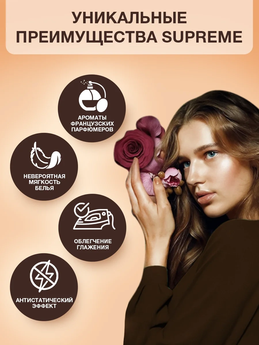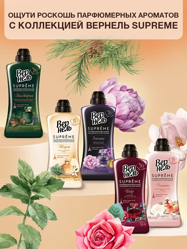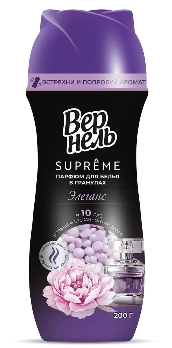 Ароматическая композиция Вернель Supreme, созданная совместно с французскими парфюмерами, подарит изысканный аромат вашему белью. Особая формула обеспечивает смягчение ткани и продолжительный аромат за счет постепенно раскрывающихся аромакапсул.