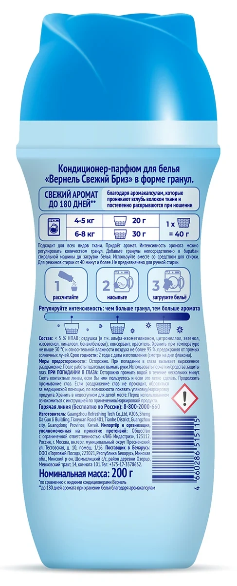 Средство придает белью антистатический эффект, мягкость и легкий ненавязчивый аромат после стирки. Применимо для белого и цветного белья, изготовленного из любых типов тканей.