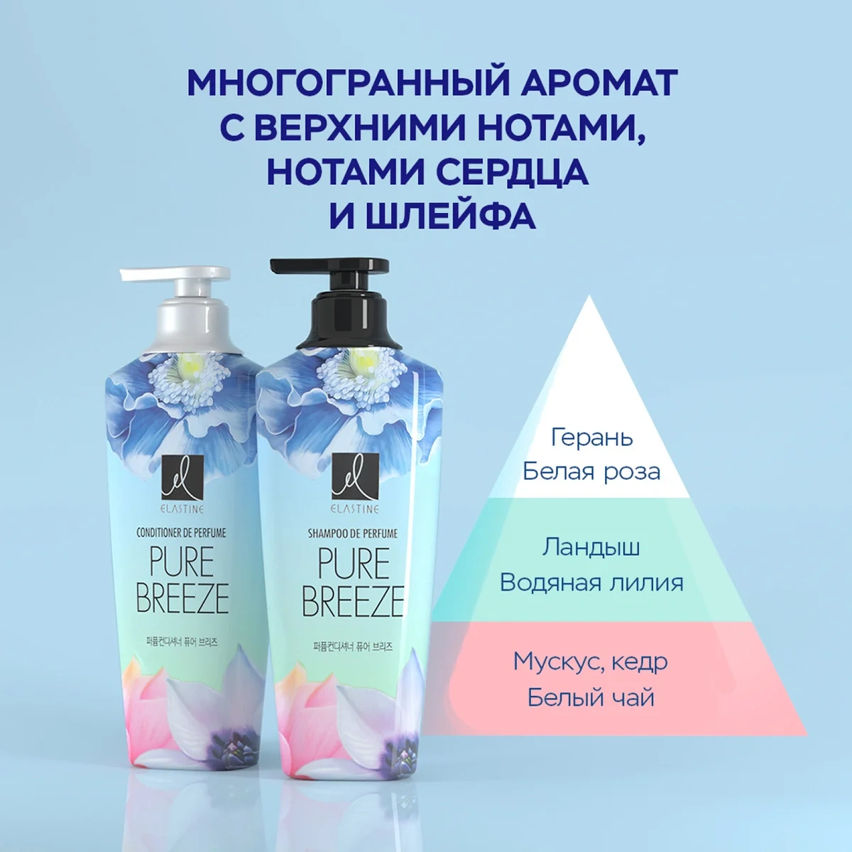 Линия парфюмированных кондиционеров Elastine разработана для того, чтобы удовлетворить самые особенные потребности женщин в уходе за волосами. Elastine имеет глубокий, сбалансированный аромат с верхними, средними и базовыми нотками, который останется надолго. Длительность сохранения аромата обеспечивается, благодаря специальной технологии эмульсии ароматических масел. Elastine Perfume Pure breeze - чистый и свежий аромат, с нотами белой розы, лотоса и белого чая.