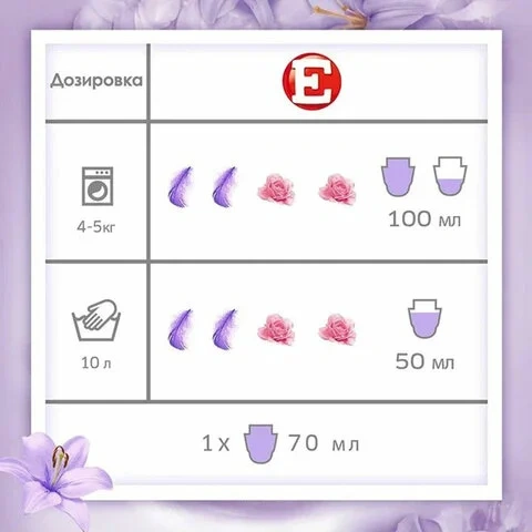 Применение: ополаскиватель для белья Е прост в использовании. Благодаря удобной крышке-дозатору вы всегда будете знать, сколько ополаскивателя для белья необходимо добавить в отделение для кондиционера в стиральной машине или при ручной стирке. Его не нужно разбавлять водой. Перед использованием рекомендуется взбалтывать. Информация по дозировке указана на обратной стороне упаковки.