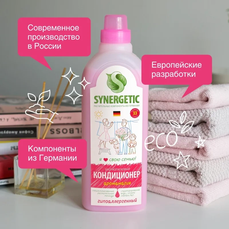 Биоразлагаемый кондиционер-ополаскиватель для белья SYNERGETIC 'Аромамагия' – высокоэффективное средство, бережно ухаживающее за всеми типами ткани, в том числе деликатными, и придающее особую мягкость и нежность белью после стирки. Гипоаллергенный кондиционер-ополаскиватель нейтрализует остатки средств для стирки на ткани, помогает сохранить структуру ткани, защищая волокна от изнашивания и повреждения. Средство обладает антистатическим эффектом. Комплекс растительных К-тензидов обеспечивает легкую глажку белья после стирки и высыхания. Гипоаллергенная парфюмерная композиция с эфирными маслами жасмина, герани, розы и нероли придает белью нежный и приятный аромат. Подходит для ручной и машинной стирки, полностью выполаскивается из тканей. Международный экологический сертификат ICEA подтверждает биоразлагаемость, безопасность и эффективность средства. Биоразлагаемые компоненты не вредят микрофлоре септических установок.