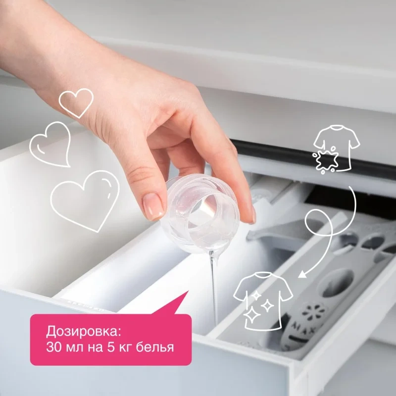 Для автоматической стирки использовать от 30 мл до 120 мл средства, в зависимости от степени загрязнения. Для ручной стирки добавить средство в воду от 30 мл до 120 мл на пять литров воды в зависимости от степени загрязнения.