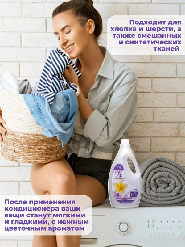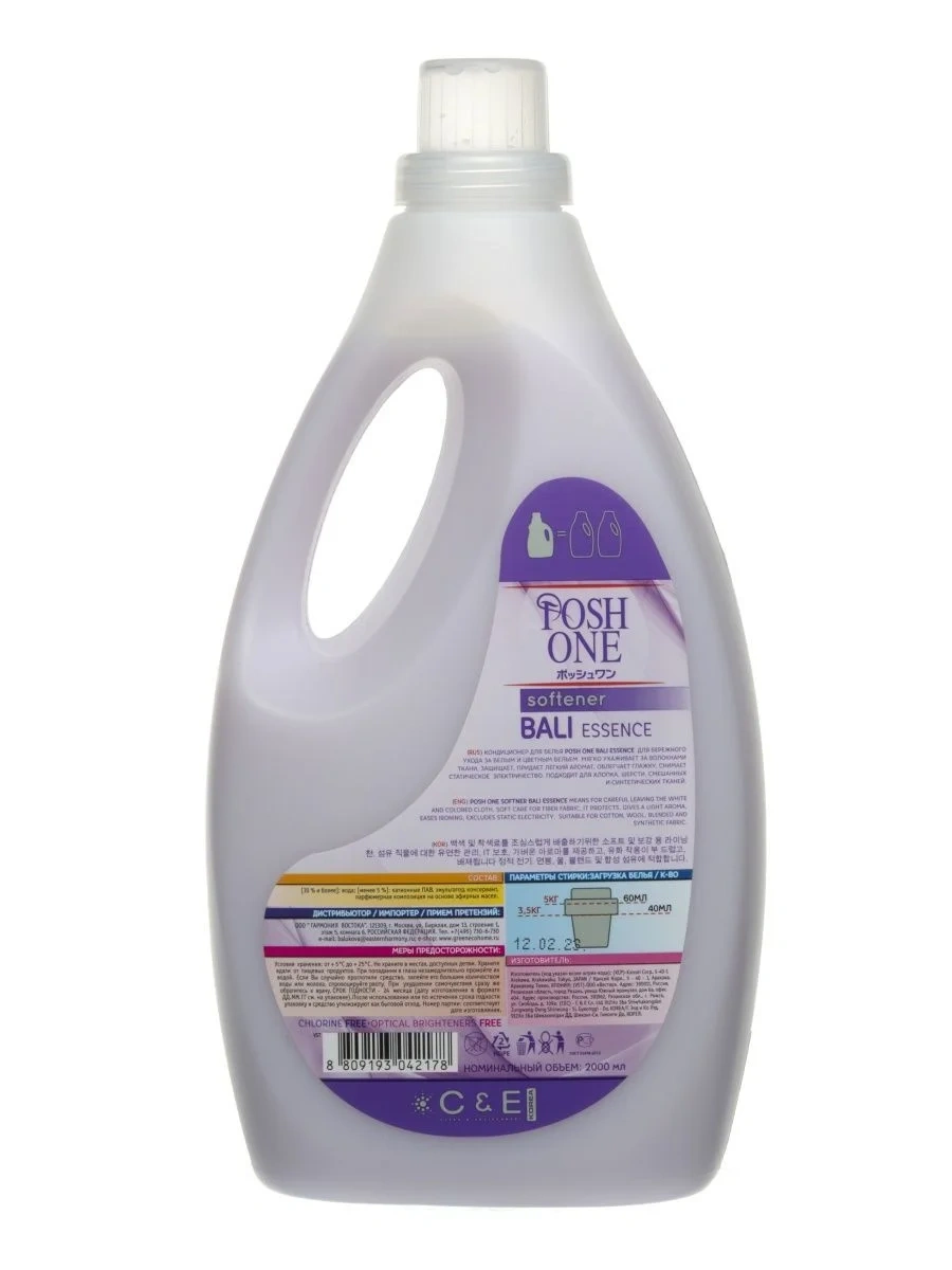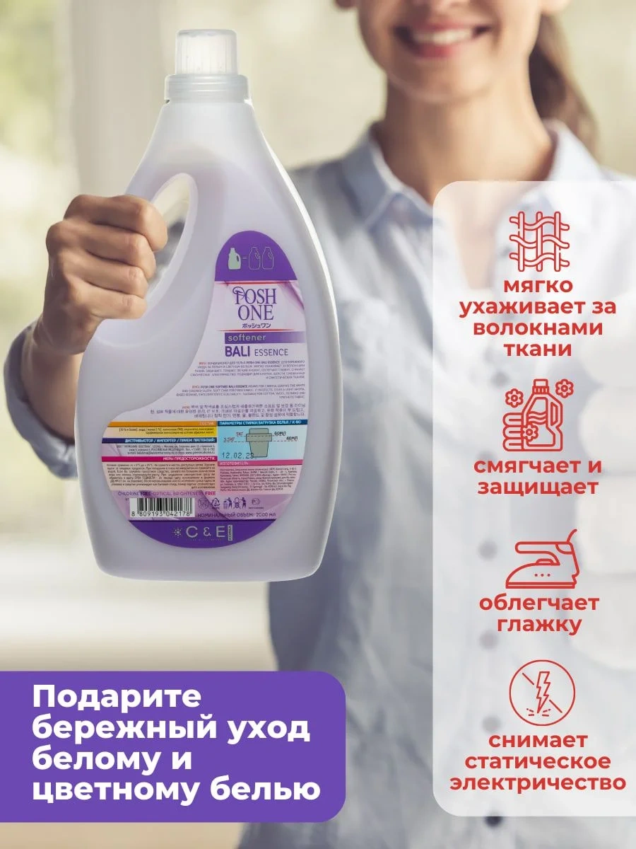 Кондиционер для белья PoshOne Bali Essence для бережного ухода за белым и цветным бельем, мягко ухаживает за волокнами ткани, защищает, придает легкий аромат, облегчает глажку, снимает статическое электричество, подходит для хлопка, шерсти, смешанных и синтетических тканей. Благодаря новой формуле с мягкой биоразлагаемой моющей основой ополаскиватель безопасен для домашних септиков. Он нейтрализует избыточный уровень pH после стирального порошка или геля для стирки, обеспечивает бережный уход, облегчает глажку и снимает статическое электричество. Густой кондиционер для белья полностью растворяется в воде, а значит не оставляет следов на ткани и не повреждает ее. Продукт повышенной экологичности не содержит: хлора, силикона, оптических добавок и других летучих токсичных компонентов; отдушка на основе натуральных эфирных масел. Гипоаллергенный ароматный кондиционер антистатик адаптирован для ежедневной стирки белья. Он предназначен для использования в стиральных машинах любого типа и ручной стирки для всех видов белых и цветных тканей (хлопок, шерсть, смешанные и синтетические ткани), а также для детского белья. Доставляется в герметичной современной упаковке с удобной ручкой и мерным колпачком. Парфюмированный кондиционер смягчитель для белья экономичен, так как большой объем 2000 мл. и высокая концентрация позволяют использовать его на протяжении нескольких месяцев. Для одной стирки достаточно всего 40 мл. средства при мягкой воде, поэтому всего флакона хватит на 50 стирок. Кондиционер для вещей смягчает воду, придает легкий аромат даже во время носки или использования белья и не оставляет белых пятен на одежде.