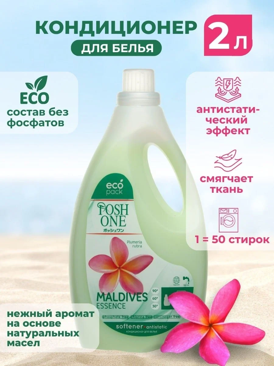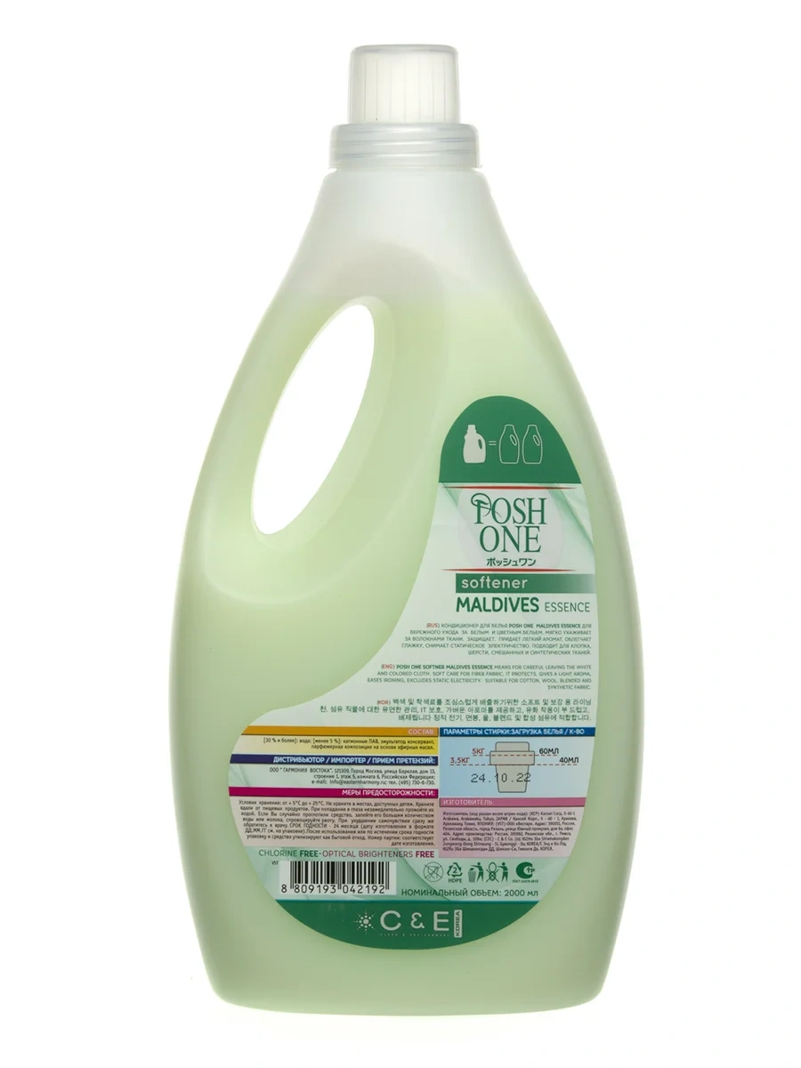 Кондиционер для белья PoshOne Maldives Essence для бережного ухода за белым и цветным бельем, мягко ухаживает за волокнами ткани, защищает, придает легкий аромат, облегчает глажку, снимает статическое электричество, подходит для хлопка, шерсти, смешанных и синтетических тканей. Обеспечивает бережный уход за белым и цветным бельем. Мягко ухаживает за волокнами ткана. Придает легкий аромат. Облачает глажку, снимает статическое электричество. Нейтрализует избыточный pH после стирального порошка или геля для стирки. Не содержит фосфатов, хлора и других оптических добавок. Парфюмерная композиция на основе натуральных эфирных масел.