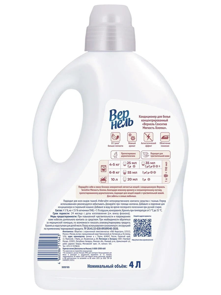 Отзывы о «Кондиционер Вернель Sensitive мягкость хлопка концентрат, 4л»