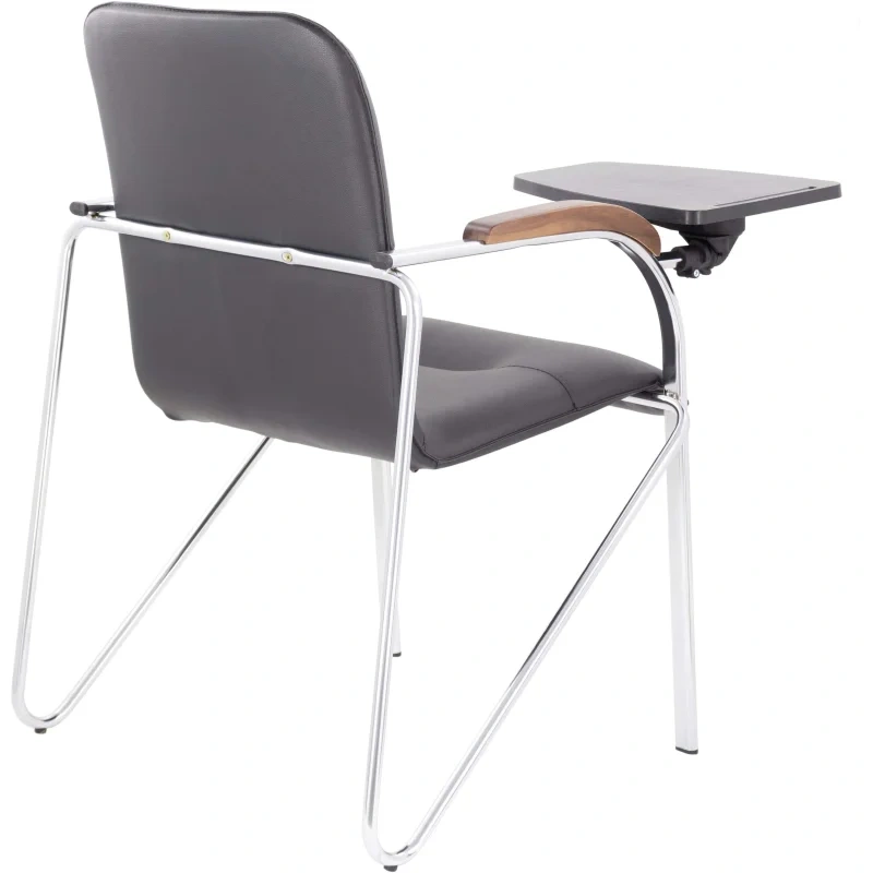 Конференц-кресло для офиса и дома. Необычная форма металлического каркаса и деревянные накладки на подлокотниках придают креслу современный вид. К креслу прилагается поворотный столик, выполненный из пластика. Модель отлично подойдет для конференц-залов, переговорных, актовых залов.