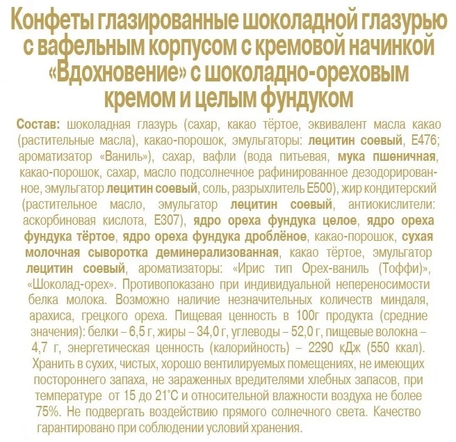 Сахар, мука пшеничная, патока крахмальная, растительные масла (пальмовое, подсолнечное, соевое), эквивалент масла какао, растительные масла (пальмовое, ши), эмульгатор лецитины, антиокислитель токоферолы, концентрат смеси, обжаренный дробленый арахис, сухая молочная сыворотка, сухое обезжиренное молоко, тертое какао, тертый обжаренный арахис, продукт экстрадированных круп и зернового сырья.