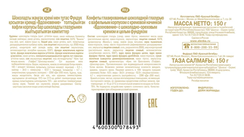 ПЭК Кранчи: мука пшеничная, сахар, соль, овсяная крупа, разрыхлитель гидрокарбонат натрия, солод пшеничный, ароматизатор, какао-порошок алкализованный, соль, агент влагоудерживающий глицерин, эмульгаторы лецитины, Е476, ароматизаторы, регулятор кислотности - молочная кислота, антиокислители - аскорбилпальмитат, токоферолы, концентрат смеси.