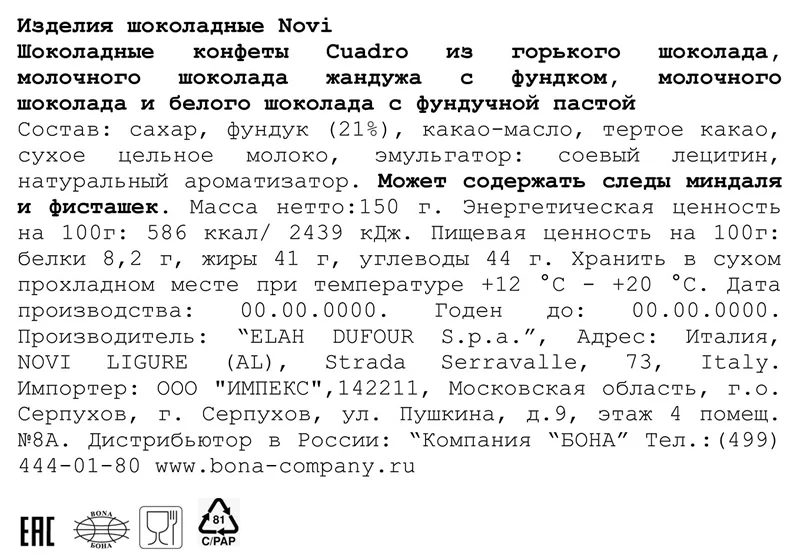 ПЭК Кранчи содержит пшеничную муку, сахар, соль, овсяную крупу, разрыхлитель гидрокарбонат натрия, солод пшеничный, ароматизатор, алкализованный какао-порошок, агент влагоудерживающий глицерин, эмульгаторы лецитины и Е476, а также регулятор кислотности - молочную кислоту. В составе присутствуют антиокислители: аскорбилпальмитат и токоферолы, концентрат смеси.