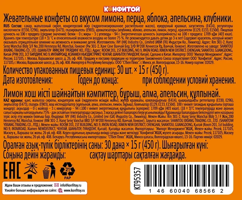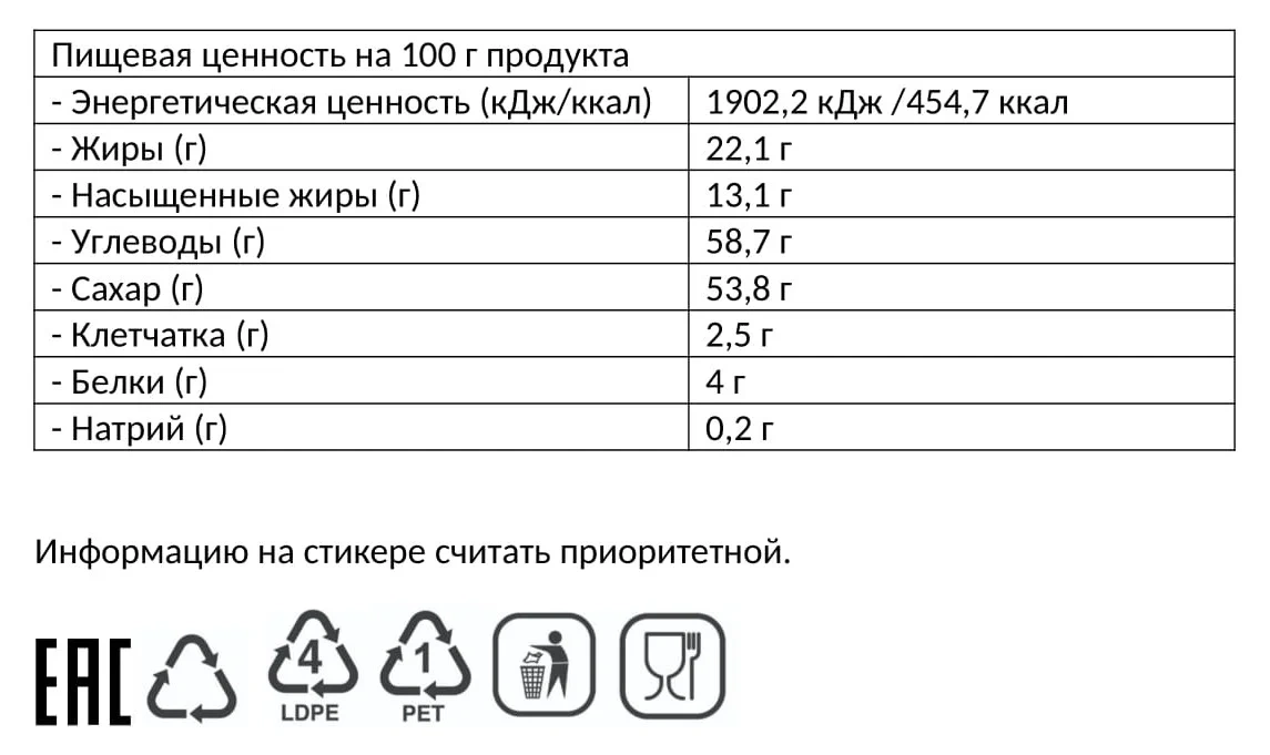 Сахар, патока крахмальная, пшеничная мука, растительные масла: пальмовое, подсолнечное, соевое. В состав входят продукты экстрадированных круп и зернового сырья: рисовая крупа, сахар, глюкоза, сухое обезжиренное молоко, масло пальмовое, соль, разрыхлитель гидрокарбонат натрия, эмульгатор лецитин соевый, сухая молочная сыворотка, эквивалент масла какао, растительные масла: ши, эмульгаторы лецитины, антиокислитель токоферолы, концентрат смеси, какао тертое, какао-порошок алкализованный, паста ядер орехов фундука обжаренных, агент влагоудерживающий глицерин, ароматизаторы, регулятор кислотности - молочная кислота, антиокислители - аскорбилпальмитат, токоферолы, концентрат смеси.