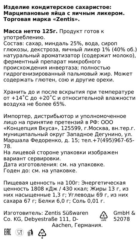 сахар, молоко цельное сгущенное с сахаром (молоко нормализованное, сахар, лактоза), патока крахмальное, масло сливочное, ароматизатор «ваниль».