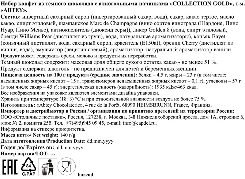 Конфеты из темного шоколада с оригинальными ликерами. Всемирно известные шоколадные конфеты в форме бутылочек, наполненные одними из самых известных оригинальных ликеров. У них нет сахарной корочки внутри, что придает превосходный вкус.