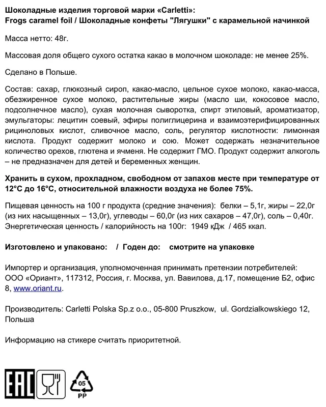 Сахар, масло пальмовое, масло какао, глюкозный сироп, какао тертое, мука соевая, молоко цельное сухое, лактоза, сыворотка молочная сухая, сироп со вкусом карамели (сахар, вода, ароматизатор, краситель E150a), крахмал картофельный, какао-порошок, мука рисовая, стружка кокосовая, ароматизаторы, молоко обезжиренное сухое, жир молочный, эмульгатор (лецитин соевый), кофе натуральный молотый, ферментный препарат микробного происхождения (инвертаза), регулятор кислотности (лимонная кислота), краситель (свекольный красный), глюкоза.