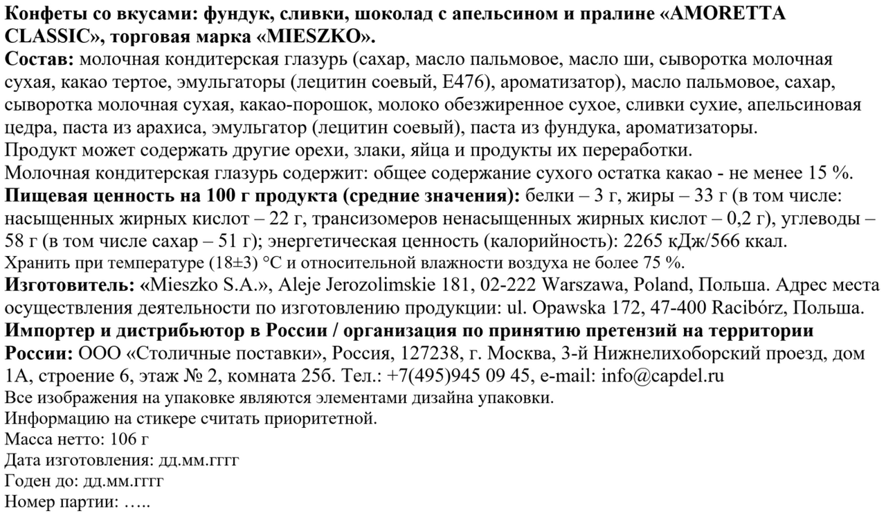 Финики с миндалем и миндальным кремом: финики сушеные, сахар, миндаль, обезжиренное сухое молоко, какао масло, негидрогенизированный растительный жир пальмовый, какао тертое, сухая молочная сыворотка, цельное сухое молоко, эмульгатор: лецитин соевый, Е476; ароматизатор - ваниль.