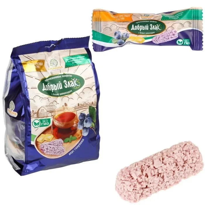 Конфеты мультизлаковые с белым шоколадом со вкусом голубики.
