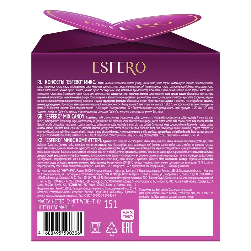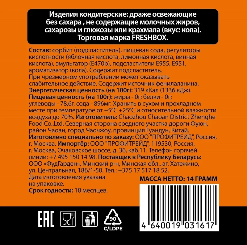 Темный шоколад: сахар, какао-масса, какао-масло, молочный жир, эмульгатор: соевый лецитин, ароматизатор, глюкозный сироп, сахар, сгущенное молоко с сахаром, молоко, сахар, этиловый спирт, концентрированный сок лайма, концентрированный апельсиновый сок, ароматизаторы, красители, экстракт паприки, E150с.