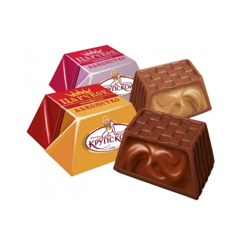 Конфеты 'Царское лакомство' - шоколадные конфеты двух видов: с шоколадно-кремовой начинкой со вкусом кураги в тёмном шоколаде и с молочно-кремовой начинкой со вкусом кофе в молочном шоколаде. Конфеты обоих видов имеют одинаковую квадратную форму. 'Царское лакомство' в темном шоколаде - конфеты с мягкой, кремовой, слегка тянущейся начинкой. В составе начинки ярко выражен вкус кураги. 'Царское лакомство' в молочном шоколаде - конфеты с кофейно-молочным вкусом. Кофе отлично сочетается со сгущённым молоком, являющимся главным компонентом начинки. Вес - 220 г. Состав: сахар, молоко цельное сгущенное с сахаром (цельное молоко, обезжиренное молоко, сахар (сахароза, лактоза)), какао тертое, эквивалент масла какао (масла растительные, эмульгатор-лецитин соевый (Е322)), сыворотка сухая молочная, жир кондитерский (масло растительное, антиокислители - Е 300, Е 307), патока, молоко сухое обезжиренное, спирт этиловый ректификованный, эмульгаторы - лецитин соевый (Е322), (Е476); какао-порошок, молоко сухое цельное, фундук, краситель сахарный колер, ароматизаторы. Пищевая ценность на 100 г продукта: белки - 4.5 г, жиры - 26 г, углеводы - 56 г. Энергетическая ценность на 100 г продукта: 470 ккал. Срок годности: 8 месяцев. Условия хранения: хранить при температуре от 15С до 21С в помещениях, не зараженных вредителями хлебных запасов при относительной влажности воздуха не более 75%. Не подвергать воздействию прямого солнечного света. Вес: 220 г. Страна производства: Россия.