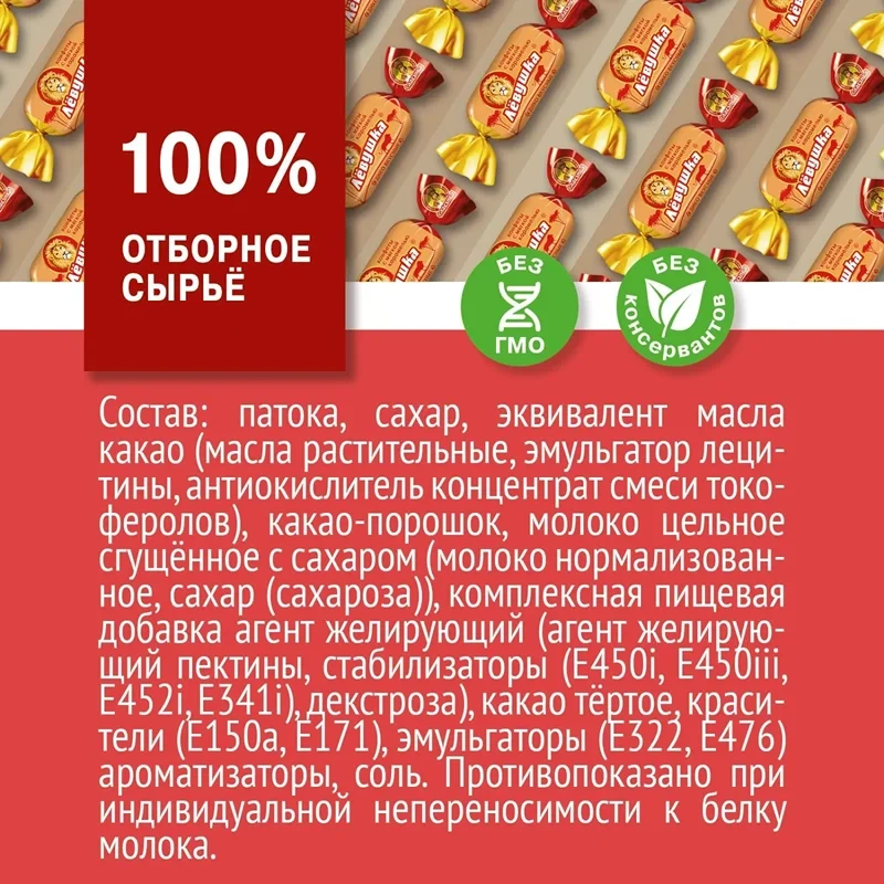 Состав: патока, сахар, какао тертое, эквивалент масла какао (масла растительные, эмульгатор лецитин соевый, антиокислитель Е306, кислота лимонная), молоко цельное сгущенное с сахаром (сахара: сахароза, лактоза, молоко цельное), агент желирующий пектин, заменитель масла какао (масла растительные, эмульгаторы: Е492, лецитин соевый, антиокислитель Е306), сыворотка молочная сухая, красители (диоксид титана, сахарный колер), эмульгаторы (лецитин соевый, E476), жир растительный (масла растительные, антиокислитель Е306), ароматизаторы, какао-порошок, соль, агент влагоудерживающий Е420. Может содержать следы муки пшеничной, яичного белка, фундука.