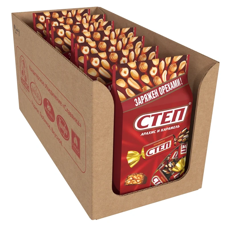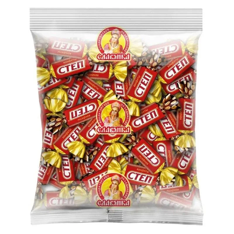 Конфеты на основе мягкой карамели с арахисом, покрытые великолепной молочной глазурью. Конфеты ''Золотой степ'' знакомое и любимое нашими соотечественниками лакомство от кондитерской фабрики ''Славянка'' - были первым аналогом заграничных ореховых батончиков на рынке. Цельный арахис в мягкой карамельной основе покрывает глазурь из великолепного молочного шоколада. Такое угощение придется очень кстати к любому чаепитии приходу гостей. Состав: арахис, патока, сахар, молоко цельное сгущенное с сахаром (сахара: сахароза, лактоза, молоко цельное), эквивалент какао- масла, жир растительный (масла растительные, антиокислители: Е319, кислота лимонная), какао-тертое, сыворотка молочная сухая, молоко сухое обезжиренное, заменитель масла, какао, эмульгаторы (лецитин, Е476), влагоудерживающий агент Е420, соль, ароматизаторы. Конфеты на основе мягкой карамели с арахисом, покрытые великолепной молочной глазурью. Конфеты ''Золотой степ'' знакомое и любимое нашими соотечественниками лакомство от кондитерской фабрики ''Славянка'' - были первым аналогом заграничных ореховых батончиков на рынке. Цельный арахис в мягкой карамельной основе покрывает глазурь из великолепного молочного шоколада. Такое угощение придется очень кстати к любому чаепитию и приходу гостей. Энергетическая ценность: 499 ккал. Хранить при температуре (18+ -3) градусов и относительной влажности воздуха не более 75%. Не подвергать воздействию прямого солнечного света. Хранить в помещениях, не зараженных вредителями хлебных запасов.