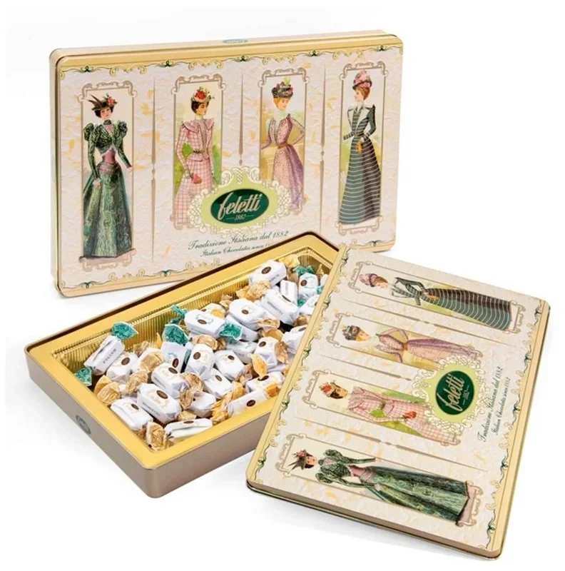 Внутри красивой жестяной коробки с изображением дам прошлого века находится три вида конфет: из молочного шоколада с фундуком, из тёмного шоколада с апельсином и из молочного шоколада с амаретто. Роскошный набор шоколадных конфет, приготовленных из отборных ингредиентов по рецептам итальянских шоколатье, станет достойным подарком для любой представительницы прекрасного пола. Ассорти с молочным и тёмным шоколадом и разнообразными начинками создано для ценителей авторского шоколада отменного качества. Набор включает конфеты с фундуком, апельсином и молочным кремом с амаретто. Фирменные конфеты в художественно оформленной жестяной коробке станут желанным подарком для любителей сладкого. Конфеты изготавливаются из отборных ингредиентов по традиционной рецептуре, бережно хранимой со времён основания фабрики.